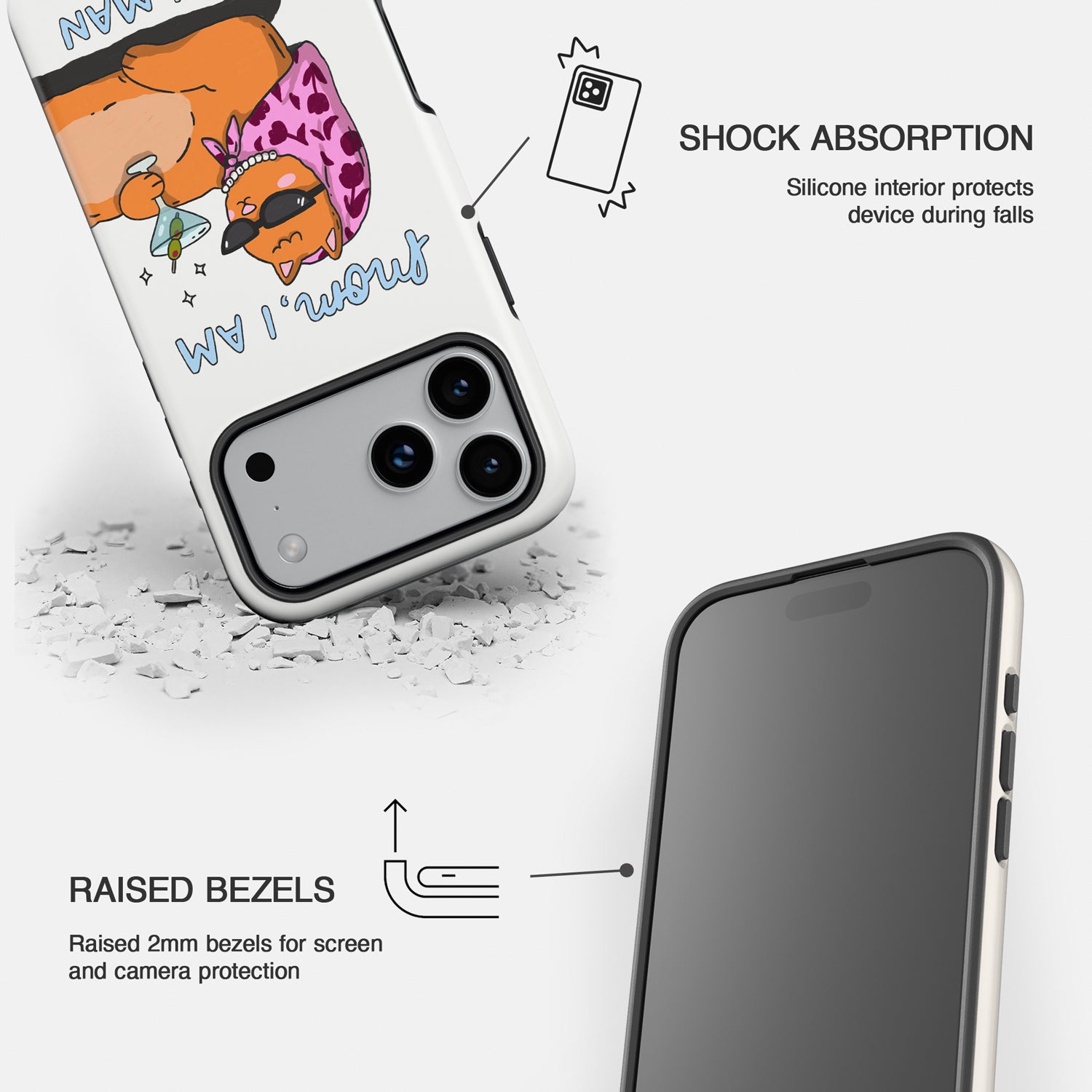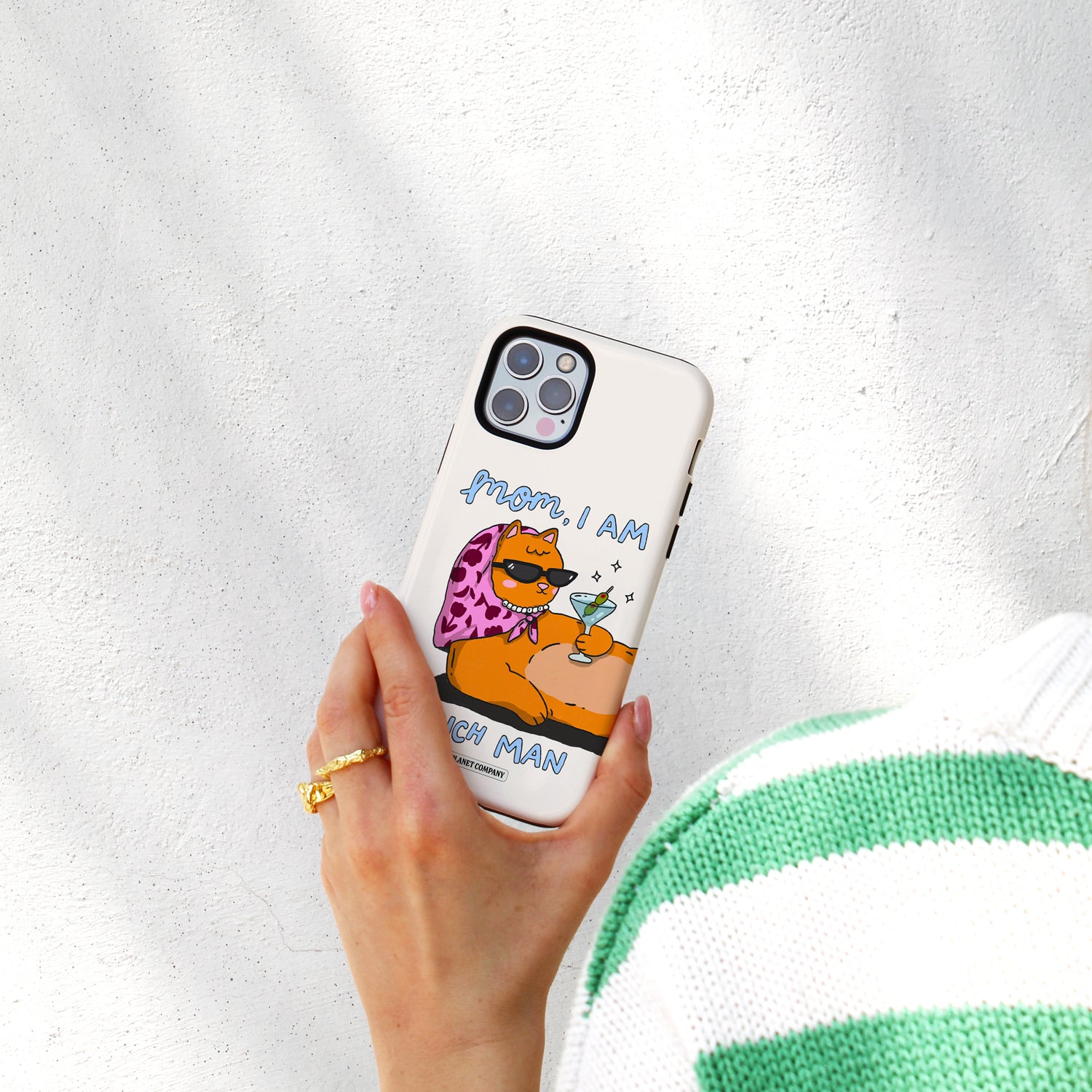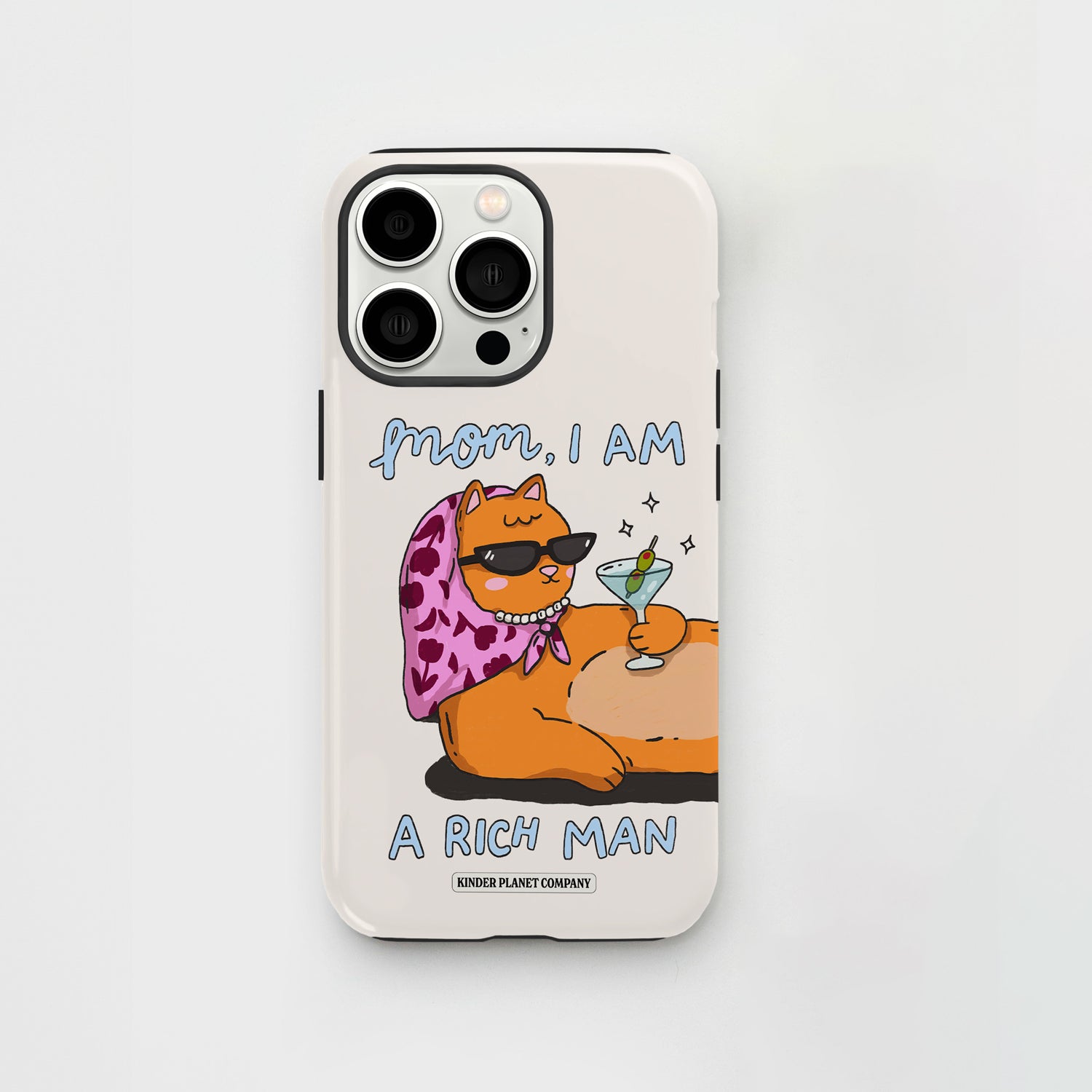 The “Mom, I Am a Rich Man” phone case features a glam cat living its best life — sunglasses on, cocktail in hand, zero apologies.