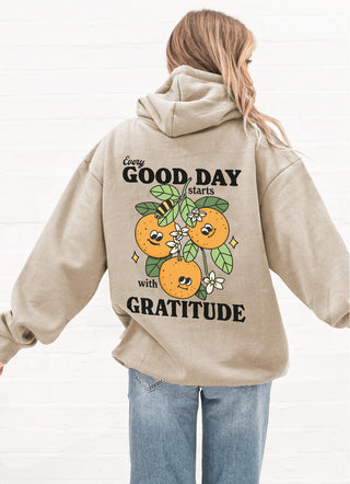 Is there a better way to spread the love than wearing this aesthetic retro tumblr hoodie featuring oranges with a quote that reads 'Every day starts with gratitude' on it?