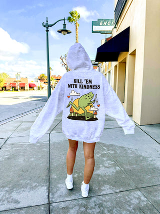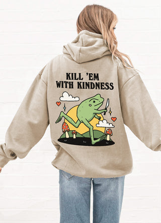 Is there a better way to spread the love than wearing this aesthetic retro tumblr hoodie featuring a frog with a quote that reads 'Kill em with Kindness' on it?