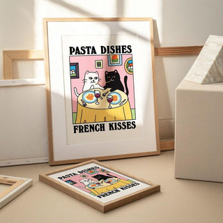 This Retro aesthetic food poster is ideal for pasta and cat lovers alike. The poster reads 'Pasta Dishes, French Kisses'. This trendy retro poster print is perfect for displaying in your living room, office space, kitchen, coffee bar or anywhere you want to add a little bit of color and love.