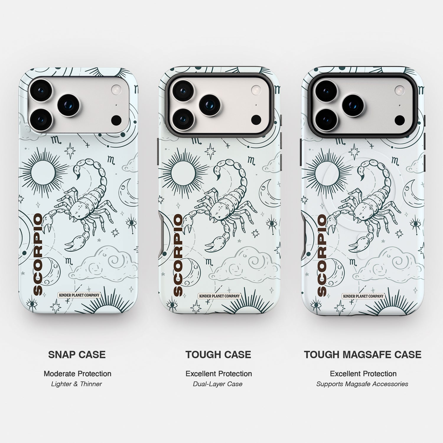 Mysterious, passionate, and endlessly powerful — the Scorpio phone case is a bold tribute to the zodiac’s most magnetic sign. With a sleek, icy gray-blue backdrop, this design features a striking scorpion surrounded by stars, moons, and Scorpio glyphs in deep charcoal tones. It's made for deep feelers, loyal protectors, and those who move through life with fierce intention. This isn’t just a phone case — it’s armor, Scorpio-style.