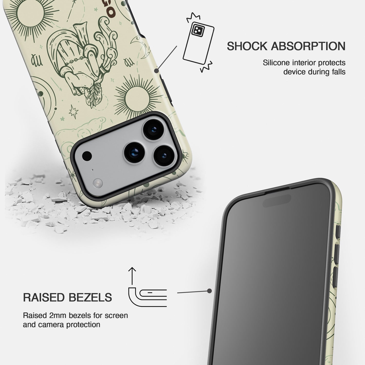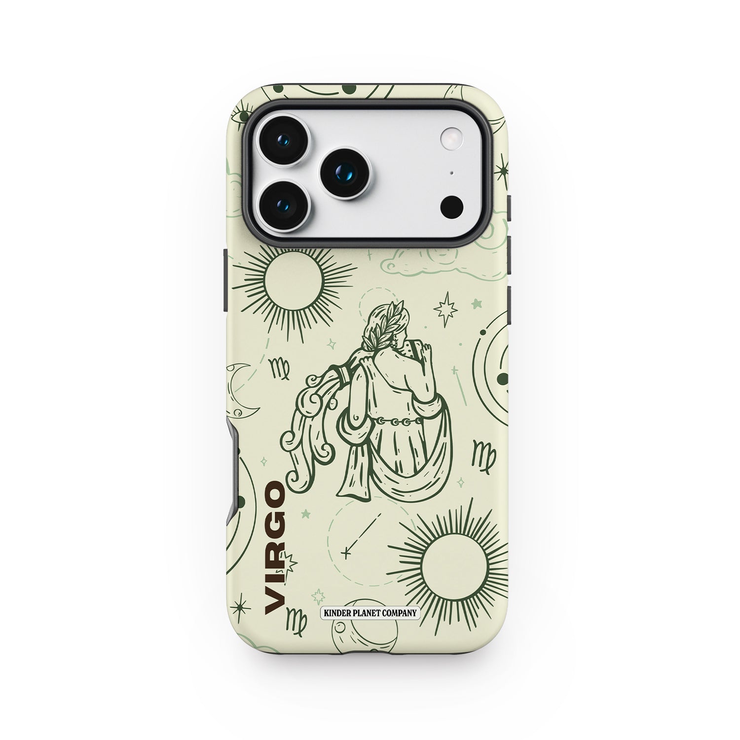 Practical, wise, and endlessly graceful — the Virgo phone case honors the quiet strength of the zodiac’s most grounded soul. Set on a soft sage green background, this celestial design features a flowing maiden surrounded by radiant suns, delicate stars, and Virgo glyphs in earthy tones. It’s made for planners, dreamers, deep thinkers, and those who find beauty in the details. Organized on the outside, magical on the inside — just like Virgo.