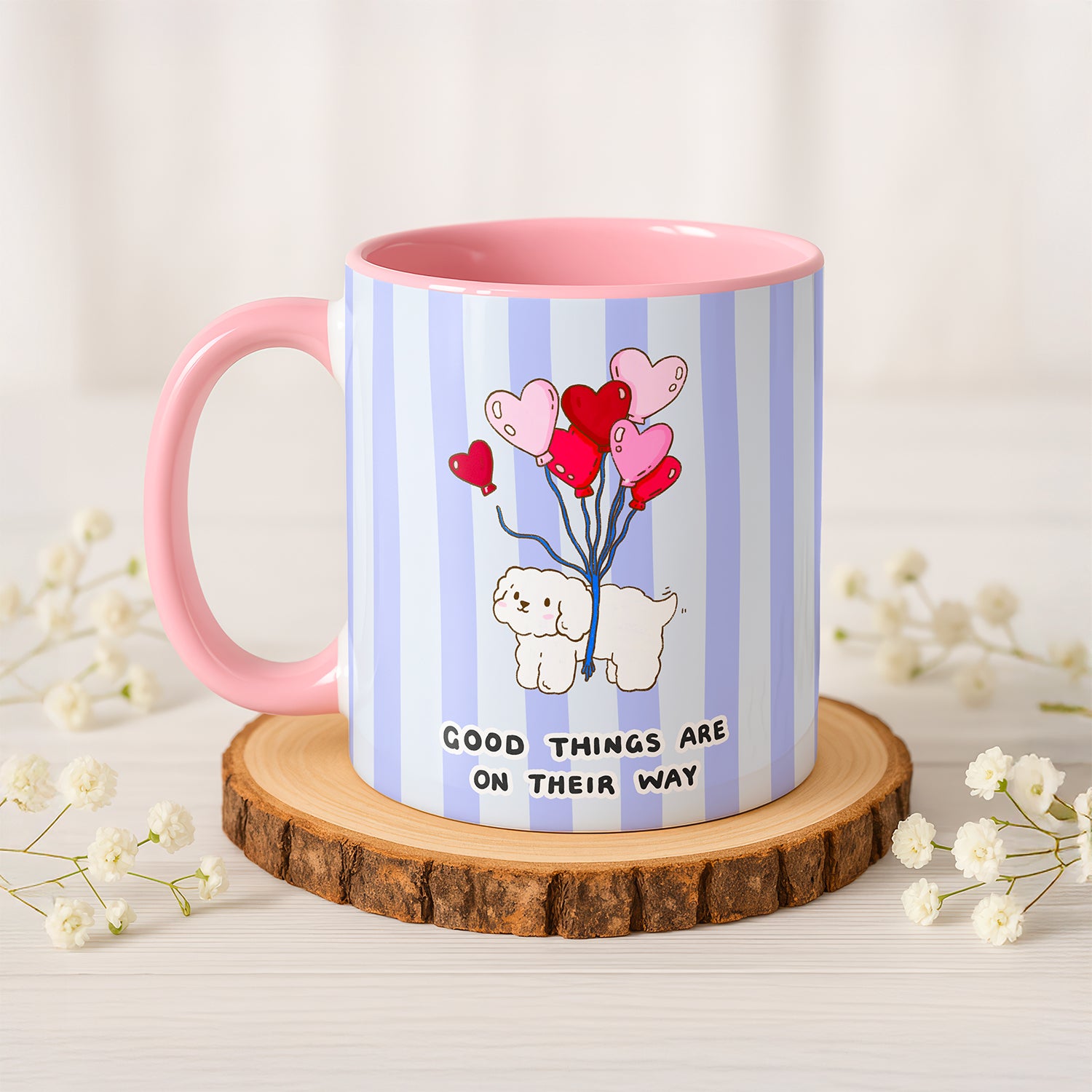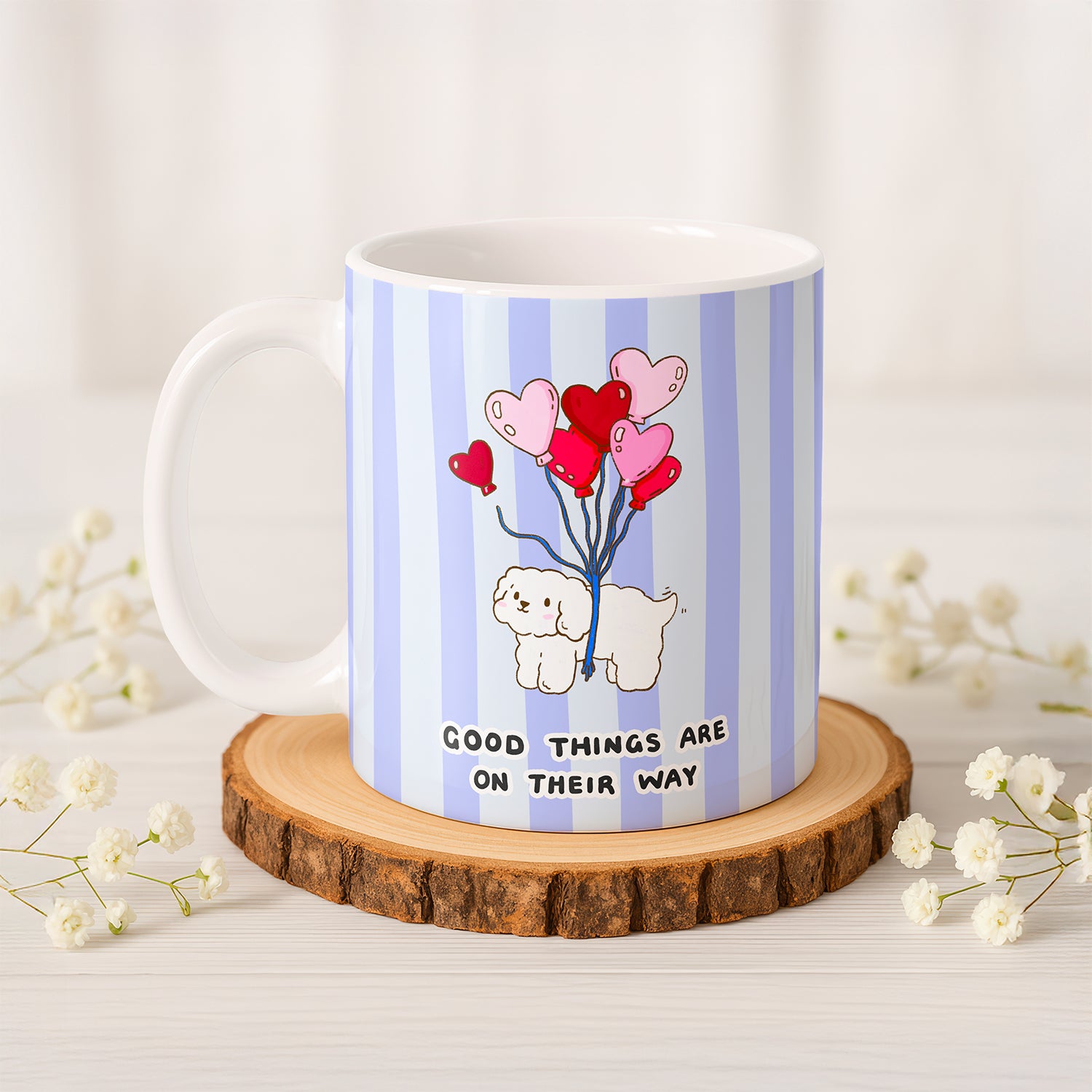 Start your day with a little hope and a lot of heart with the “Good Things Are On Their Way” mug ☀️🐶🎈