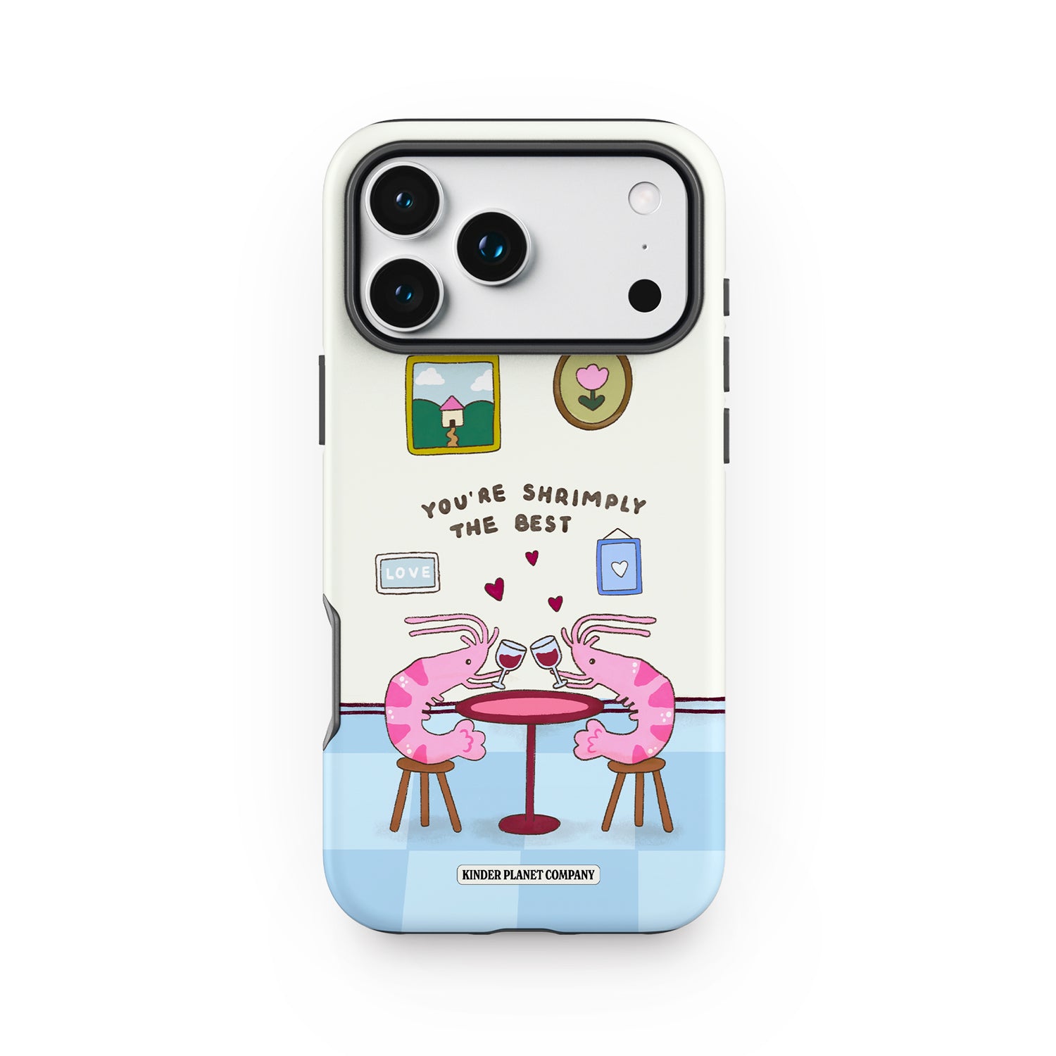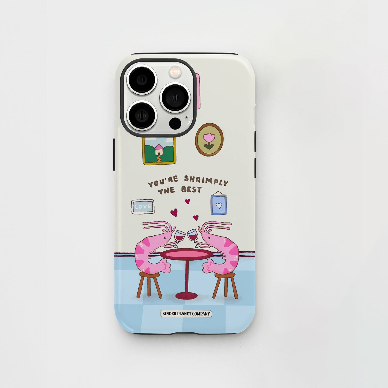 This adorable design features two little shrimp sharing a cute dinner date, clinking glasses under tiny floating hearts. With its cozy pastel colours and playful pun, it’s the perfect case for romantics, besties, and anyone who loves a little humour with their aesthetic.