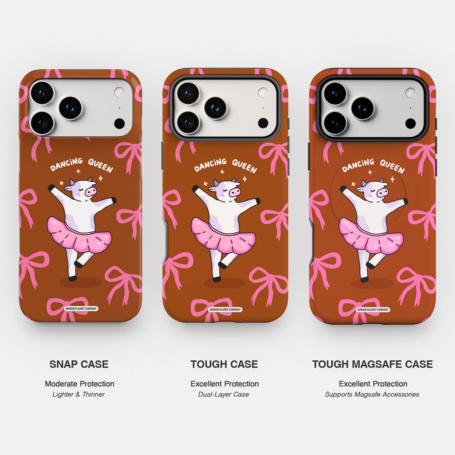 Bring main-character energy to your everyday carry with this playful Dancing Queen case. The rich brown backdrop, pink bow accents, and twirling cow graphic make it feel cute, bold, and a little bit extra.