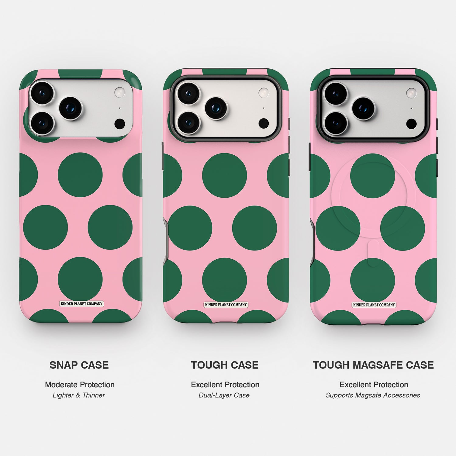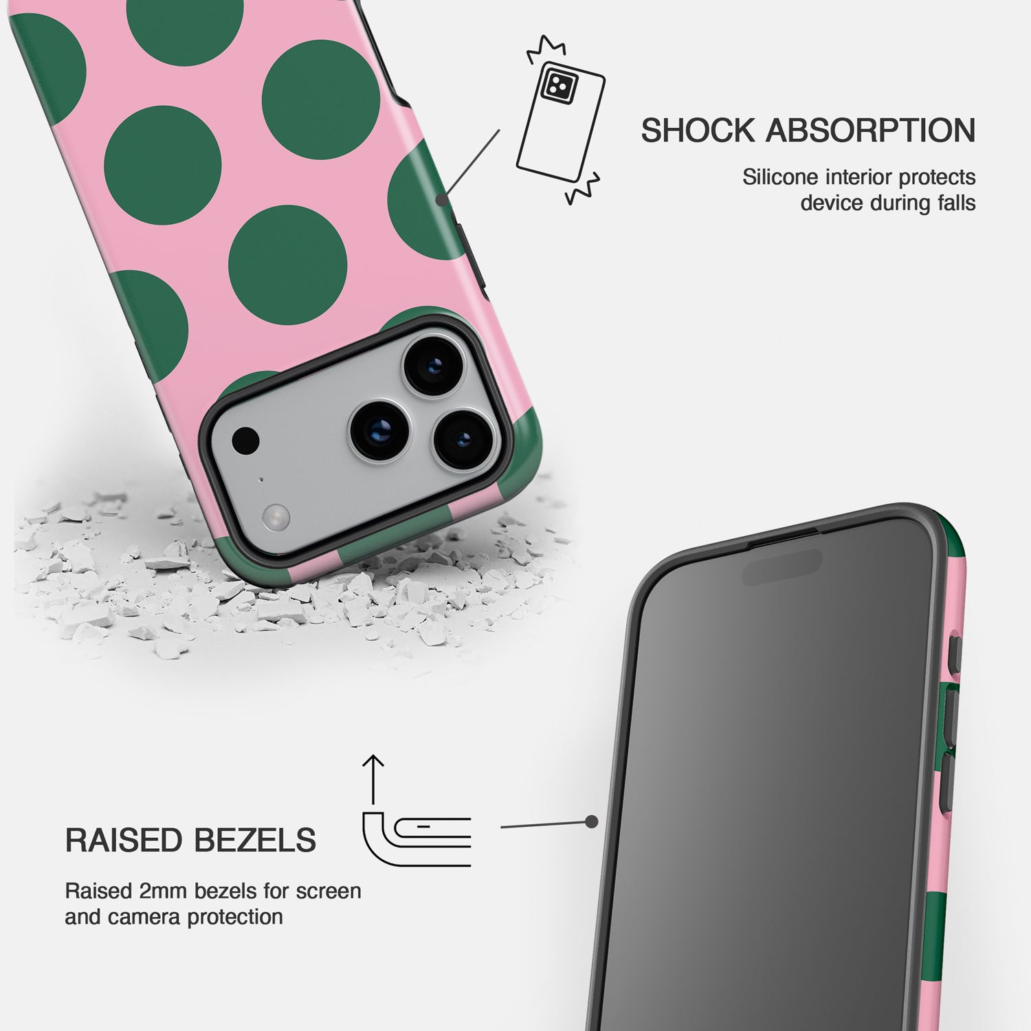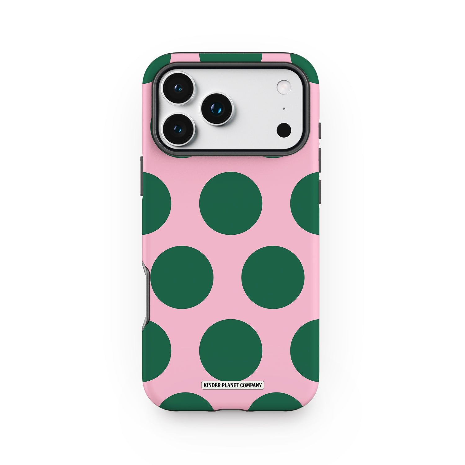 Pretty with a punchy twist, this case brings playful polka dots in fresh green over a soft pink base for an instantly styled look.