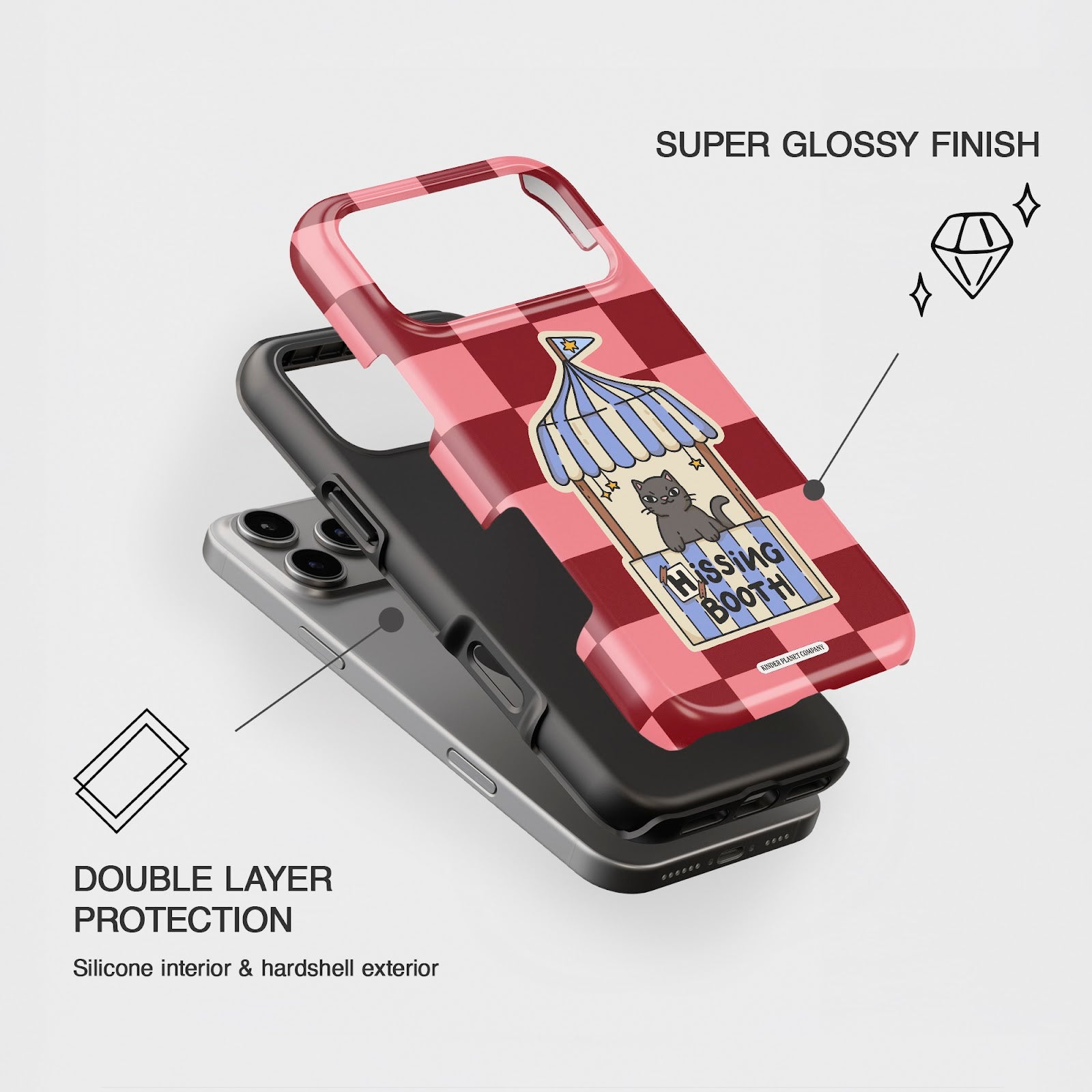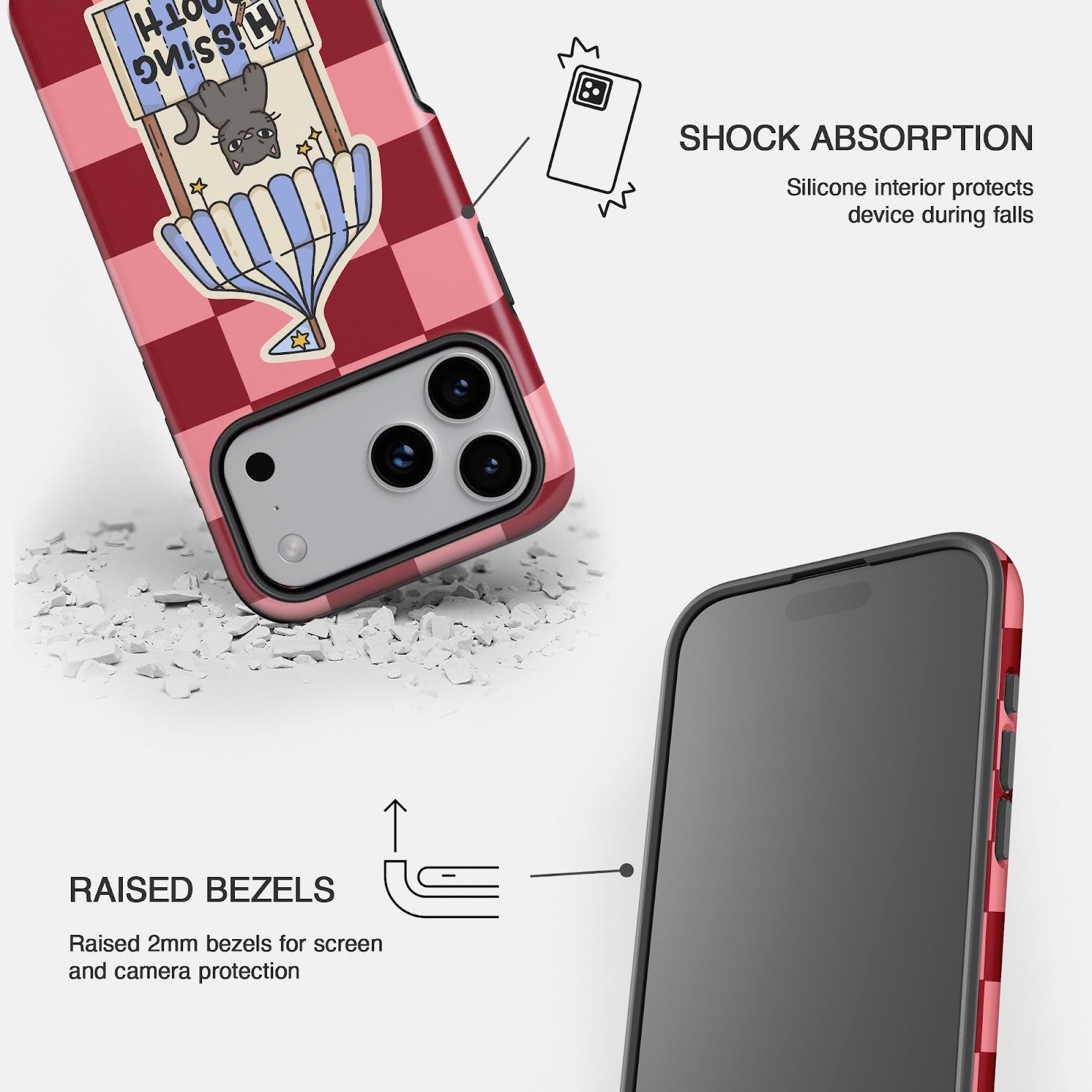 Meet your new favorite conversation starter: a playful phone case with a bold checkerboard backdrop and a cheeky carnival-cat motif.