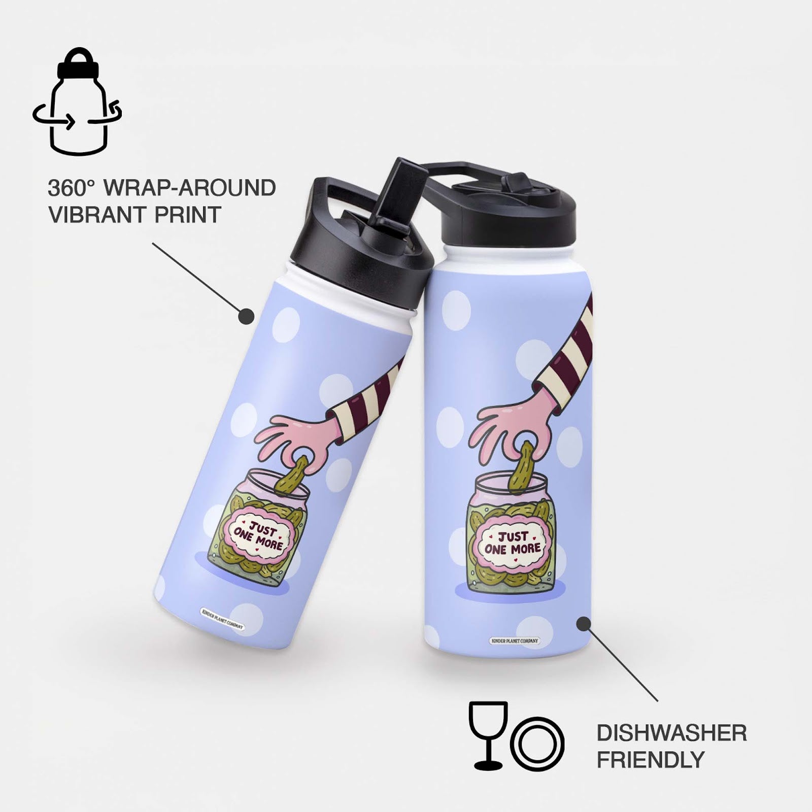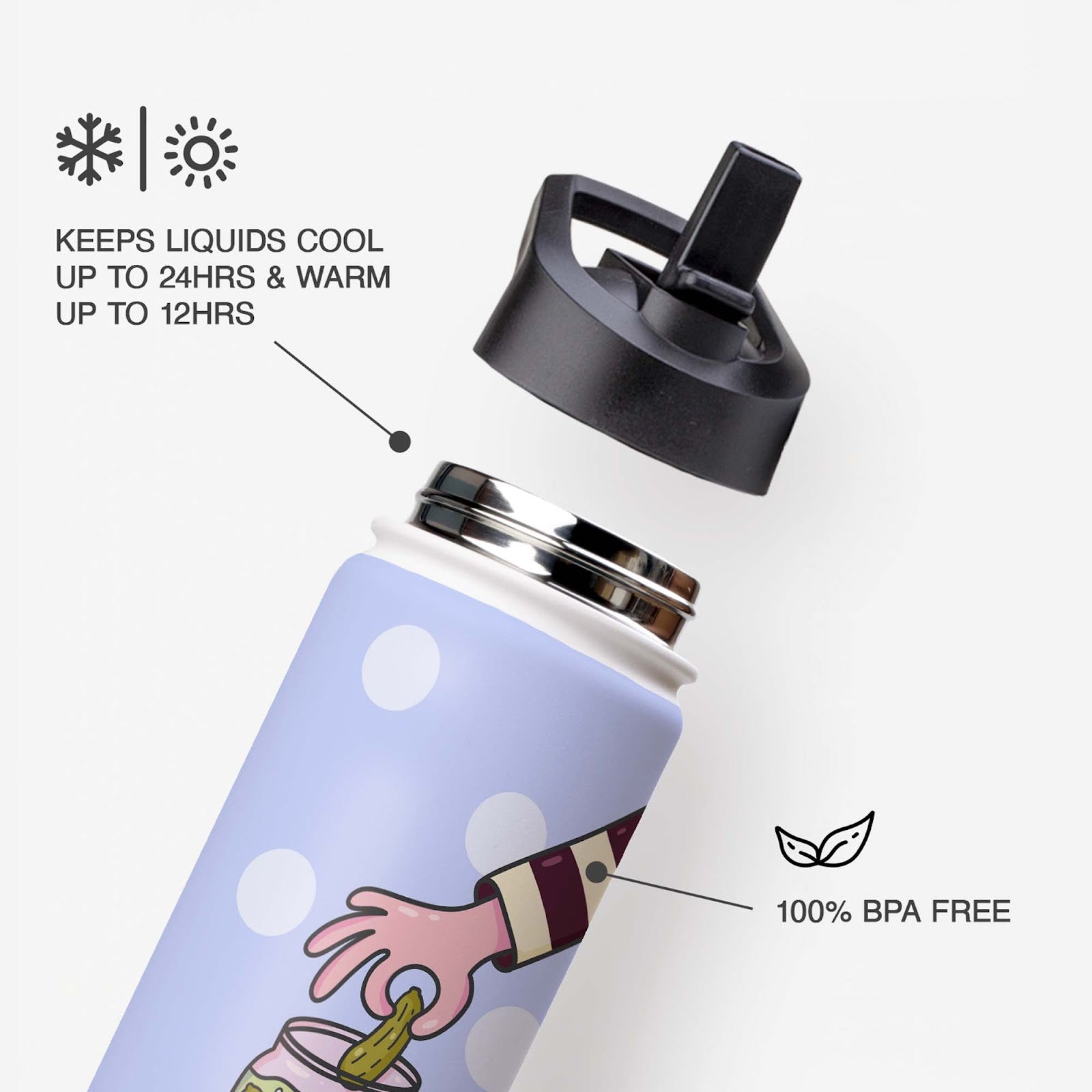 Designed with an easy-carry handle, flip top sipper with straw, and leak proof finish, this stainless steel bottle helps keep drinks at the right temperature in style.