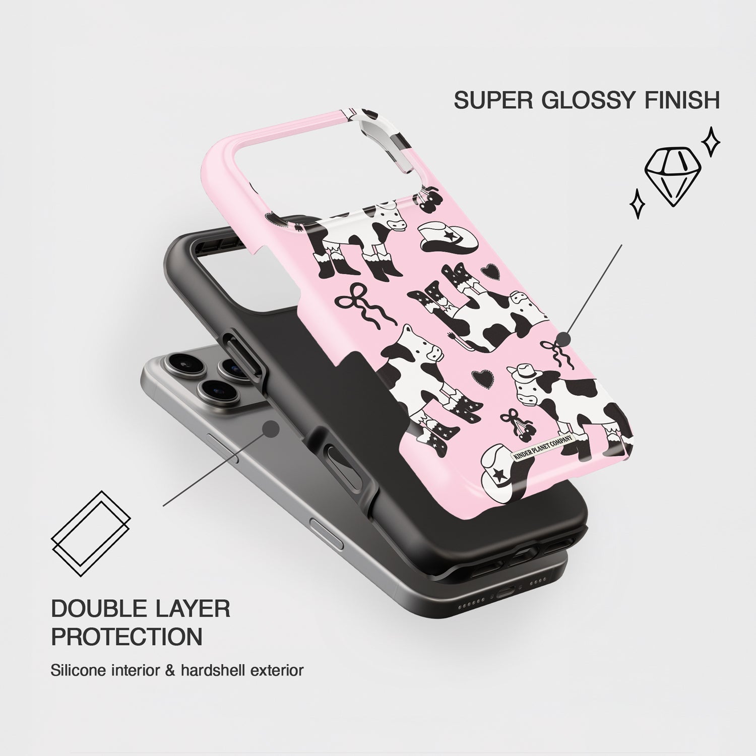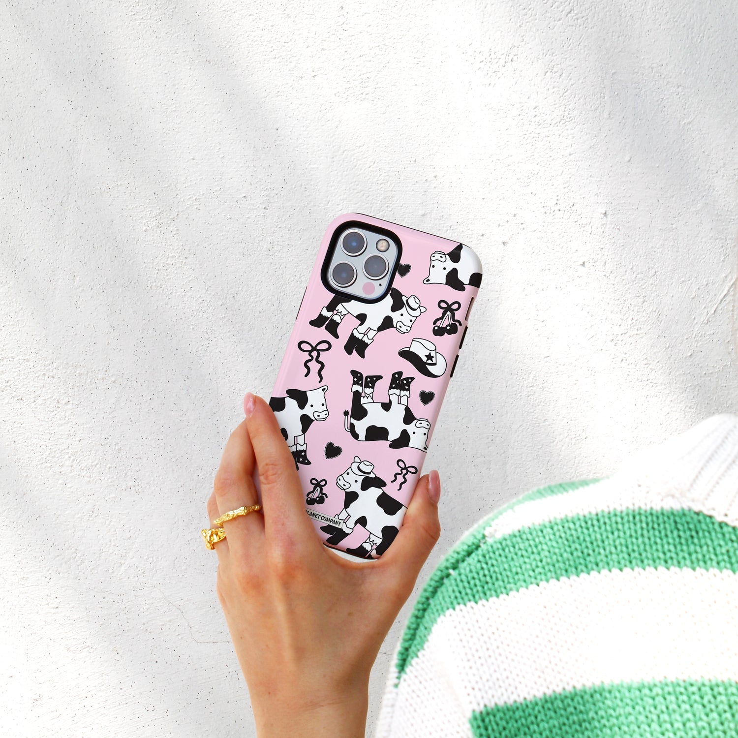 Straight outta the wild west (with a detour through Barbie’s dream ranch), this case is 100% certified yee-cute. Featuring pastel pink cow print, disco energy, and a “New Boot Goofin’” slogan that says “I paid too much for these boots and I regret nothing.”