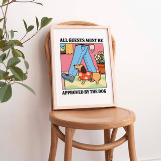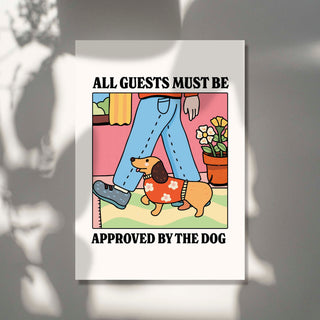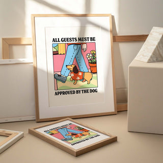 Add a dash of humor and charm to your home with our “All Guests Must Be Approved by the Dog” art print! Featuring a stylish dachshund in a floral sweater keeping close tabs on a new arrival, this cozy scene captures the true gatekeeper of the house, the pup. With its bold colors, cheerful setting, and playful message, it’s the paw-fect piece for dog lovers who know their furry friend runs the show. A delightful addition to entryways, living rooms, or gallery walls, wherever your four-legged security chief holds court!