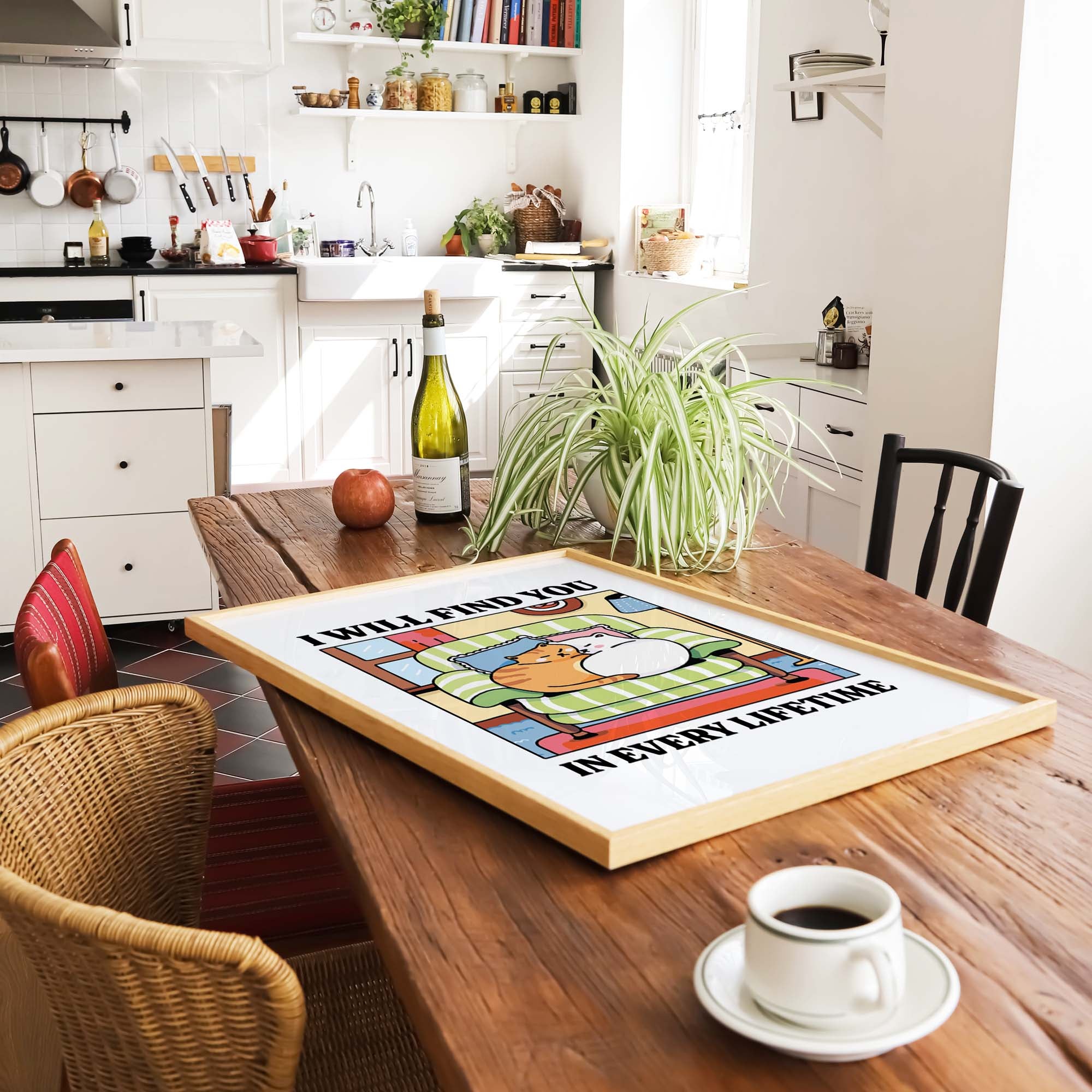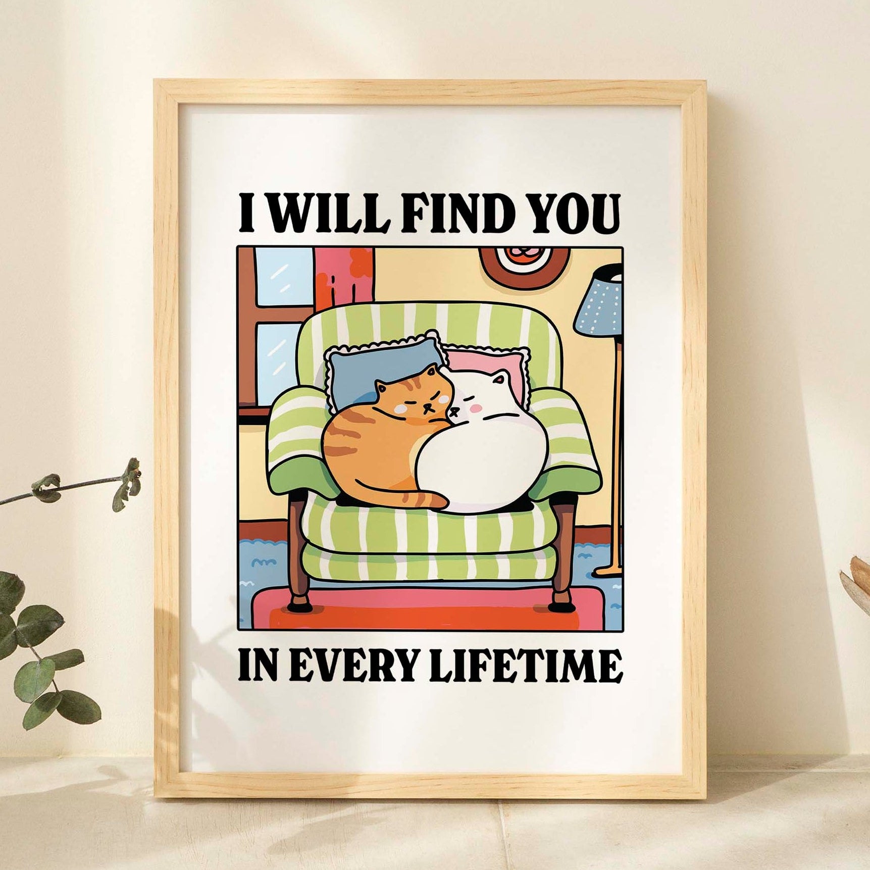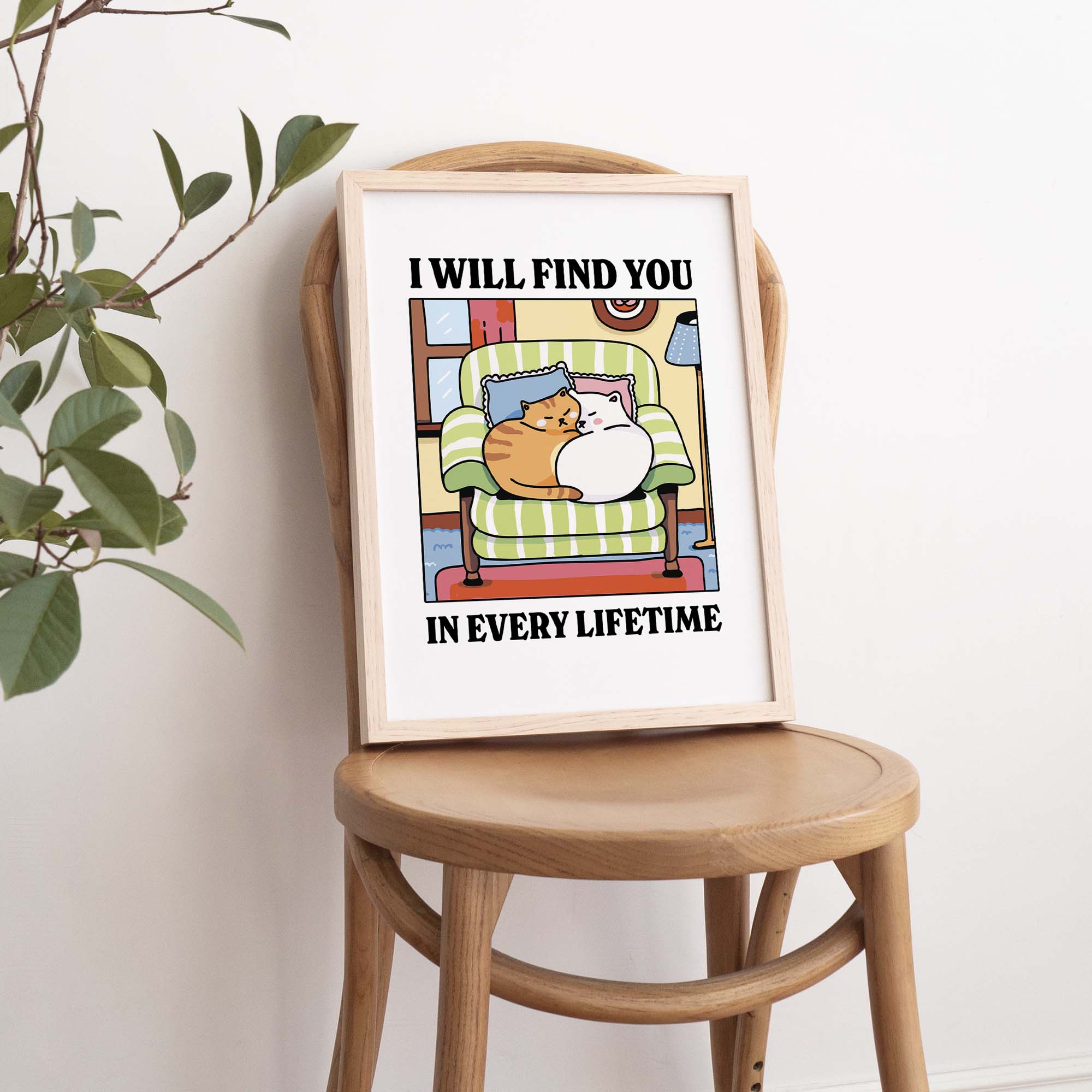 The I Will Find You in Every Lifetime art print features two cuddly cats snuggled up on a soft green armchair, wrapped in warmth and unconditional love. Set in a cozy living room scene with soft pastels and comforting textures, this print is a reminder that soul connections always find their way — no matter the time, place, or lifetime.