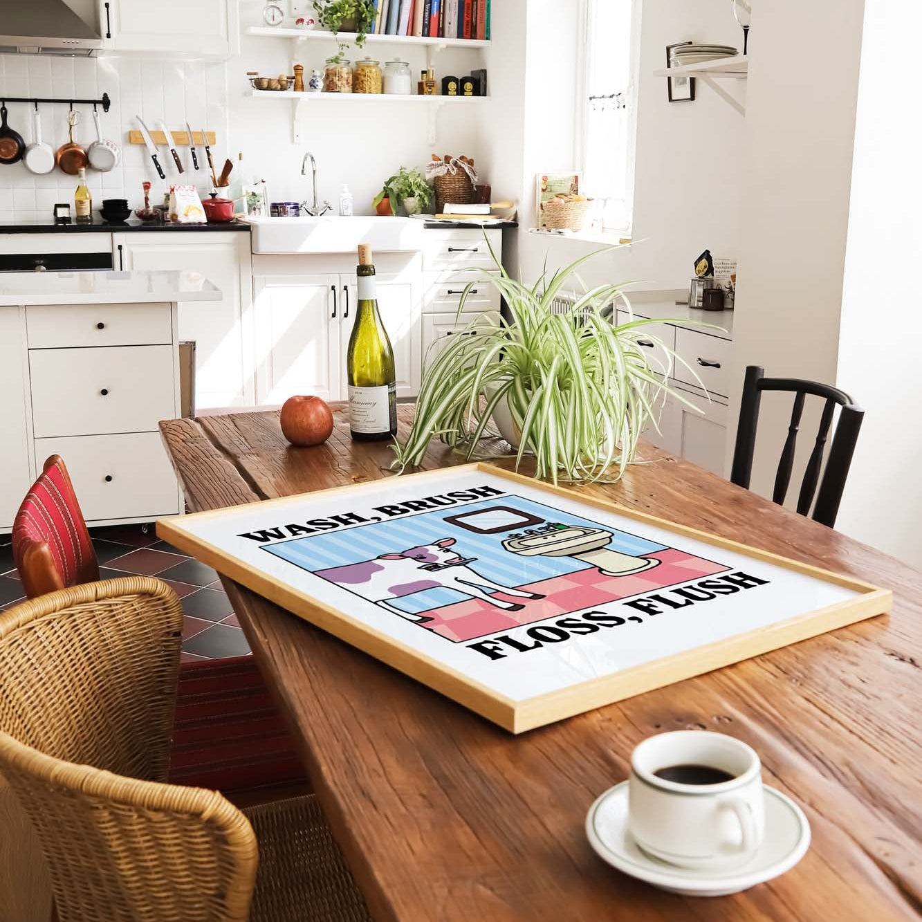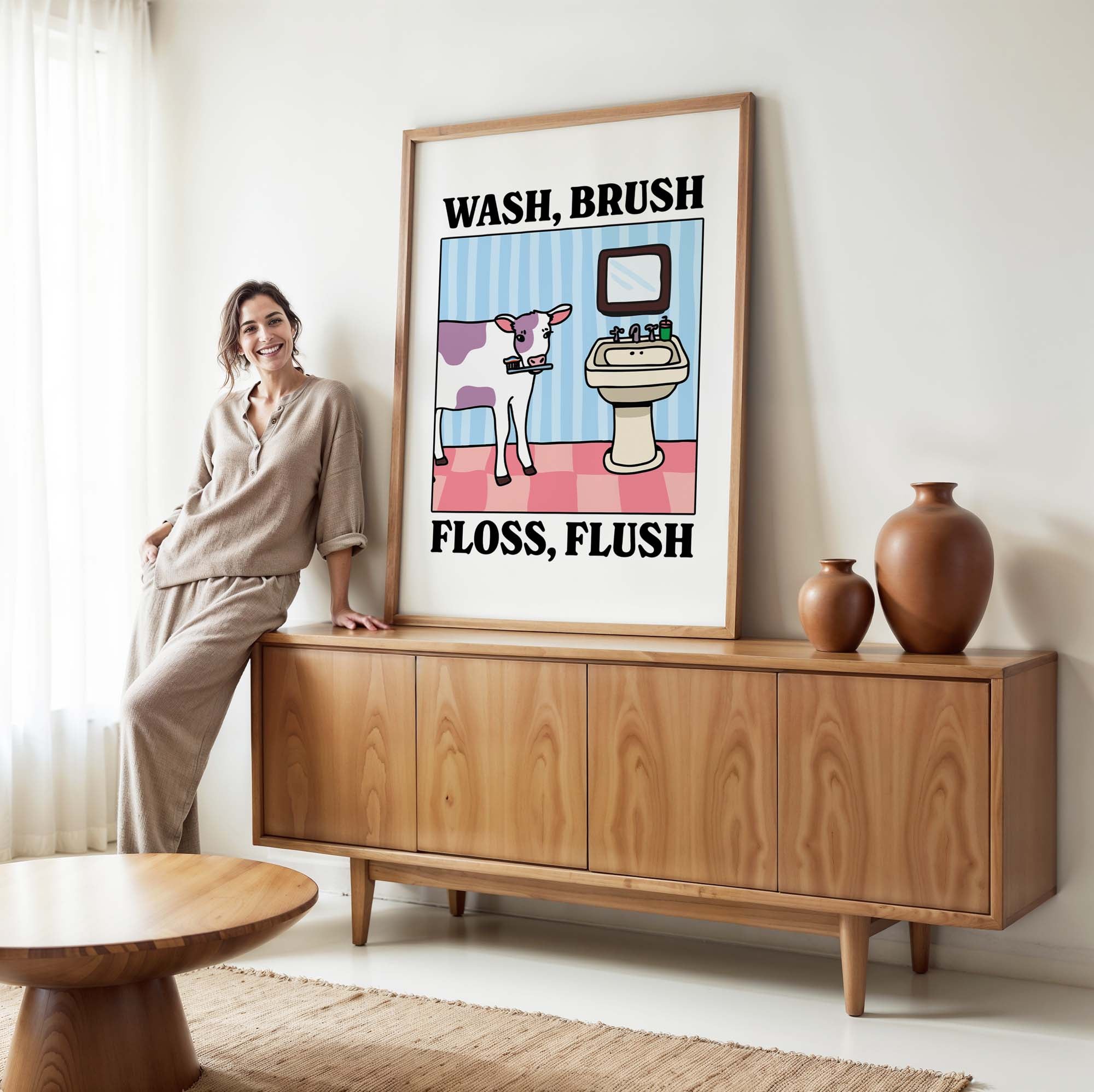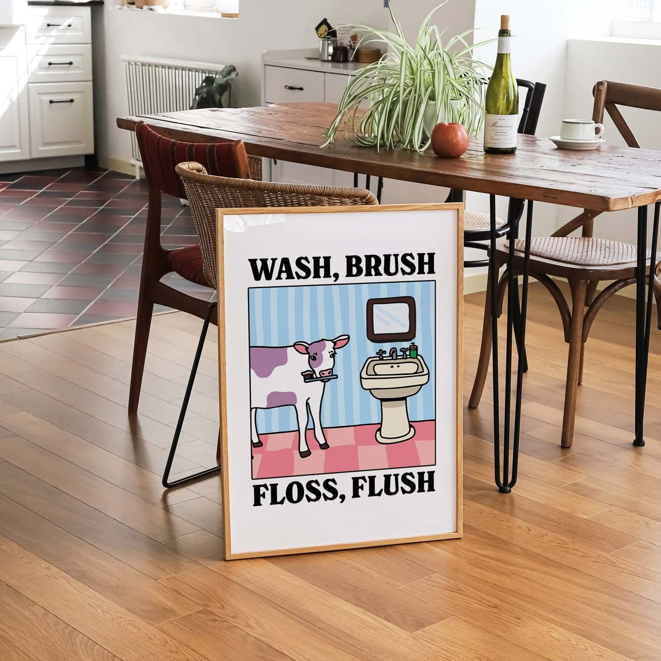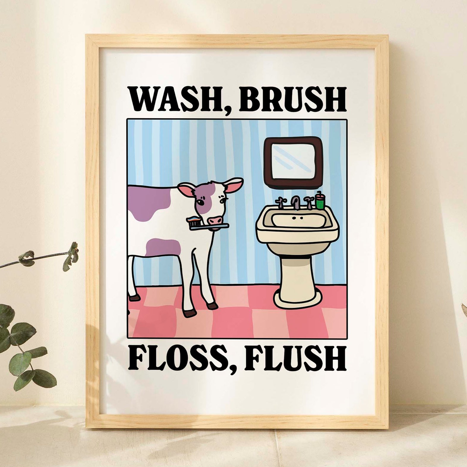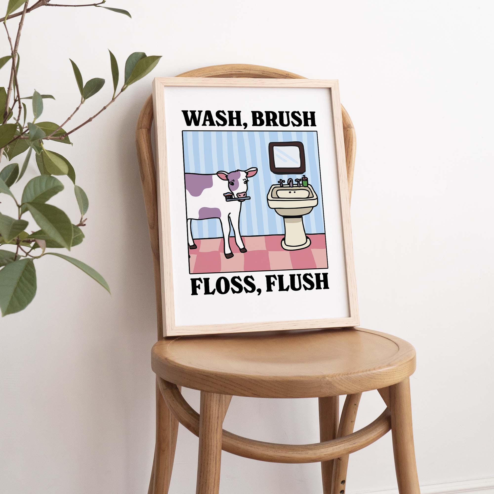 This playful poster serves as a cute reminder to keep your hands and teeth clean. With its adorable cow illustration and quirky slogan 'wash brush floss flush', this retro print will brighten up any space - whether it's your classroom, office, or bathroom! Hand-drawn and one-of-a-kind, these illustrations add a touch of color and love wherever they're displayed.