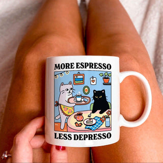 Add some playful vibes to your mug collection with this adorably retro 'More Espresso, Less Depresso' cat mug! Featuring a quirky hand-drawn illustration of two cats enjoying a coffee at a cafe, it's the perfect gift for any coffee enthusiast.