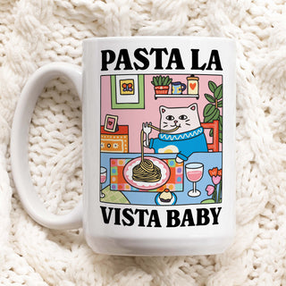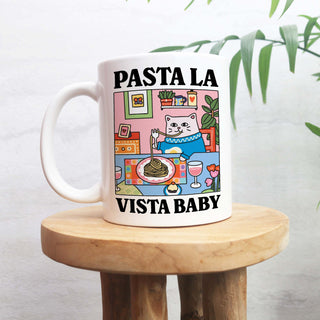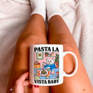 Our Pasta La Vista Baby Cat Mug is the purr-fect blend of carbs and comedy. Featuring a charming kitty twirling spaghetti in a colorful kitchen setting, this mug is ideal for pasta lovers, pun enthusiasts, and anyone who appreciates a cozy meal with a side of sass because nothing says comfort like noodles and a cat with impeccable taste!