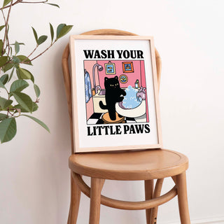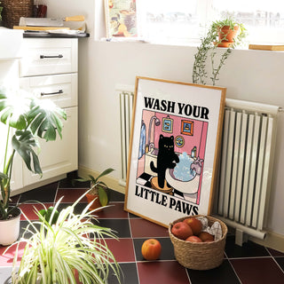 This playful poster serves as a cute reminder to keep your hands clean. With its adorable cat illustration and quirky slogan 'wash your little paws', this retro print will brighten up any space - whether it's your classroom, office, or bathroom! Hand-drawn and one-of-a-kind, these illustrations add a touch of color and love wherever they're displayed.